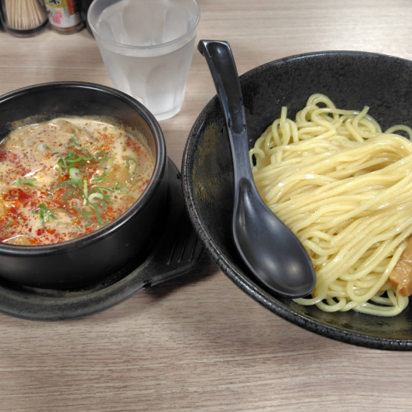 東京都品川区大井1-1-7マップで見る辛とんの並の高温でグツグツ煮えた豚骨白湯出汁ベースのつけ汁は辣油と胡麻の風味がバランス良くマリアージュ。麺は多加水中太スト麺で冷水でキンキンに締められもちもち食感。熱々のつけ汁に浸った薄豚バラ肉も旨し。