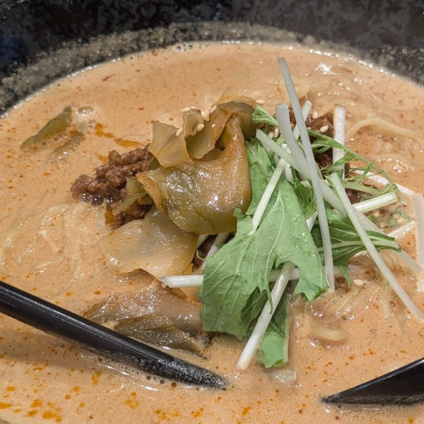 埼玉県さいたま市浦和区北浦和4-6-10-2マップで見る辛口担々麺の硬目濃目の白胡麻ベースのカエシに辣油と挽肉たっぷりの濃厚な甘辛餡はしっかり麺に絡む。麺は加水高目の中細ウェブ麺でもちもち弾力。替え玉一回。搾菜も肉味噌も旨し。