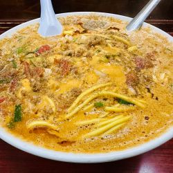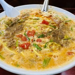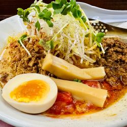 | 備考 | 食券購入制。 製麺は三河屋製麺によるもので、 オーション・全粒粉・ライ麦を配合した、 加水率36%、20番の切り刃で仕上げた中細麺(150g)。 スープは魚介系は鯵煮干し、サンマ節からとった出汁に、 動物系は大山鶏のガラ・手羽先・骨を中心に、 モミジ・豚足・豚背脂や 玉葱端材・長ネギ端材などを加えて仕込む。 また途中でだしガラを加えることにより 荒々しさを付与している。 なお動物系2:魚介系3の割合でブレンド。 香味油は白締油と鶏脂に サンマ節・花カツオ・鯵煮干しを加えて魚介の香りを抽出。 「こく醤油」の醤油だれは濃口とたまり醤油に サンマ節・鰹節・混合節を入れ、煮切ったミリンを加える。 隠し味にナンプラー・リンゴ酢や生姜を加えて 個性的かつ独特の深みをもたらしている。 チャーシューは国産豚肩ロース肉を低温調理したのち 中国醤油をからめて窯で吊るし焼きしたもの。 鶏モモ肉のチャーシューは表面をバーナーで こんがり炙ってから低温調理を施す。 (以上は「中華そばNEO(柴田書店刊)」より) |