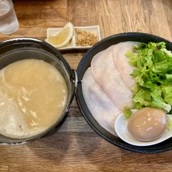 「濃厚鶏白湯つけ麺/レモン」@麺屋時茂の写真1年振りの来店。前回と比べて、味玉のタレがレンゲの上にもかかっていた(?)。