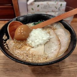 レタス、玉ねぎ、鶏チャーシューなど具材のバランスが取れていて、にんにくが加わることで通常のラーメンよりパンチが増した印象。レモンでの味変も良かった。