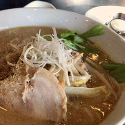 スープは、白味噌メインでとろりと粘りがあり、たっぷりなゴマでコーティングされ風味の良いスープです😆